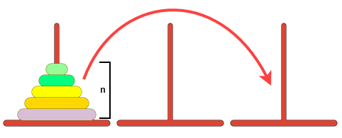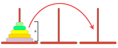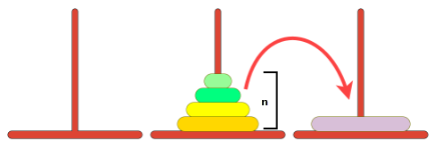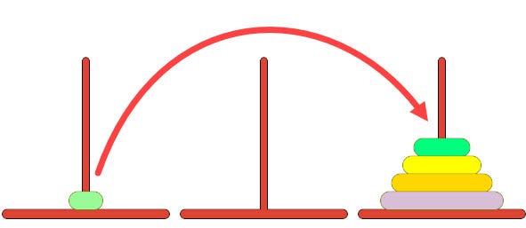 Once you identified the simpler problem proceed to find the simplest problem your function will need to solve. This simplest problem is called base case. It is usually represented as a form of a condition which terminates recursion. In our previous examples, it comes in the form of a for loop that checks whether there are elements in an array (sum) or children in a node (find). Sometimes, in easy problems, the simpler problem that helps you solve the original problem is the also the base case. But it’s not the case with harder problems like this famous “Tower of Hanoi” problem: