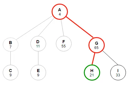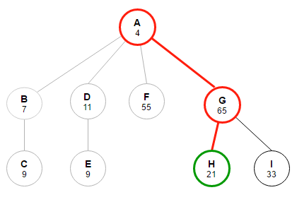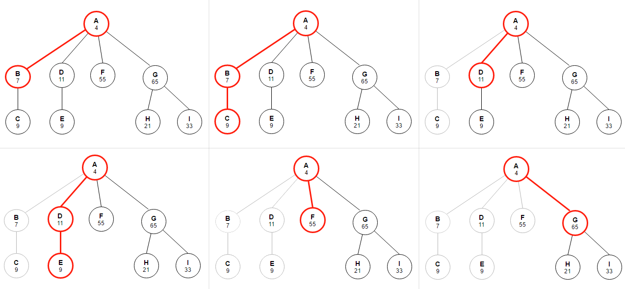 - No node on our path satisfies the equality and there is nowhere to go from here, so we backtrack to A.