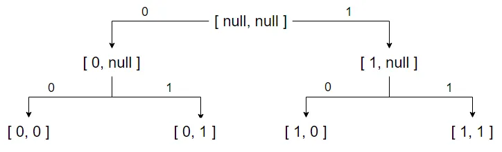 2as the number of bits, it should produce the following 4 combinations:00,01,10,11. You cannot use any mathematical operators.